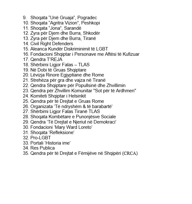 35 organizata të cilat punojnë për mbrojtjen e të drejtave të njeriut, të drejtave të vajzave dhe grave, dhe me fokus të veçantë te viktimat e dhunës me bazë gjinore, i kanë drejtuar Televizionit Kombëtar “Top Channel” – Programit “Dua te të bëj të lumtur”, një thirrje për shmangien e trajtimit riviktimizues ndaj viktimave të dhunës në familje dhe për dhënien e mesazheve të drejta kundër dhunës me bazë gjinore.