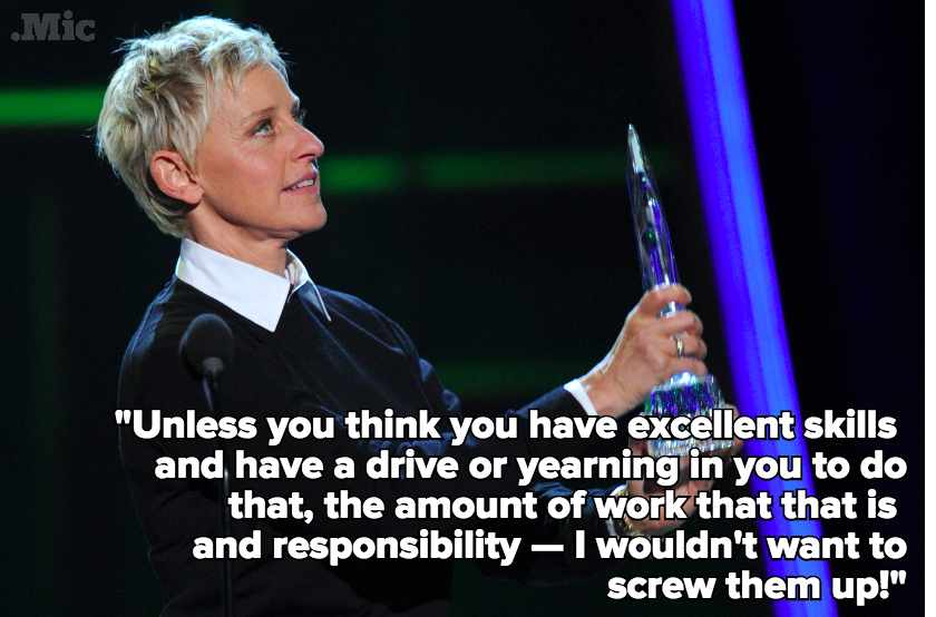 - Ellen DeGeneres: “Nëse mendon se ke aftësi të shkëlqyera dhe një shtysë dëshire brenda teje për ta bërë këtë gjë, sasia e punës dhe përgjegjësia janë shumë të mëdha– nuk do të doja të shkatërroja çdo gjë!”