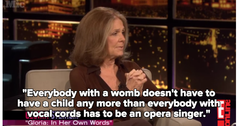 - Gloria Steinem: “Jo çdo person që ka mitër duhet të lindë fëmijë, ashtu siç jo çdo person që ka korda vokale nuk duhet të këndojë në opera.”
