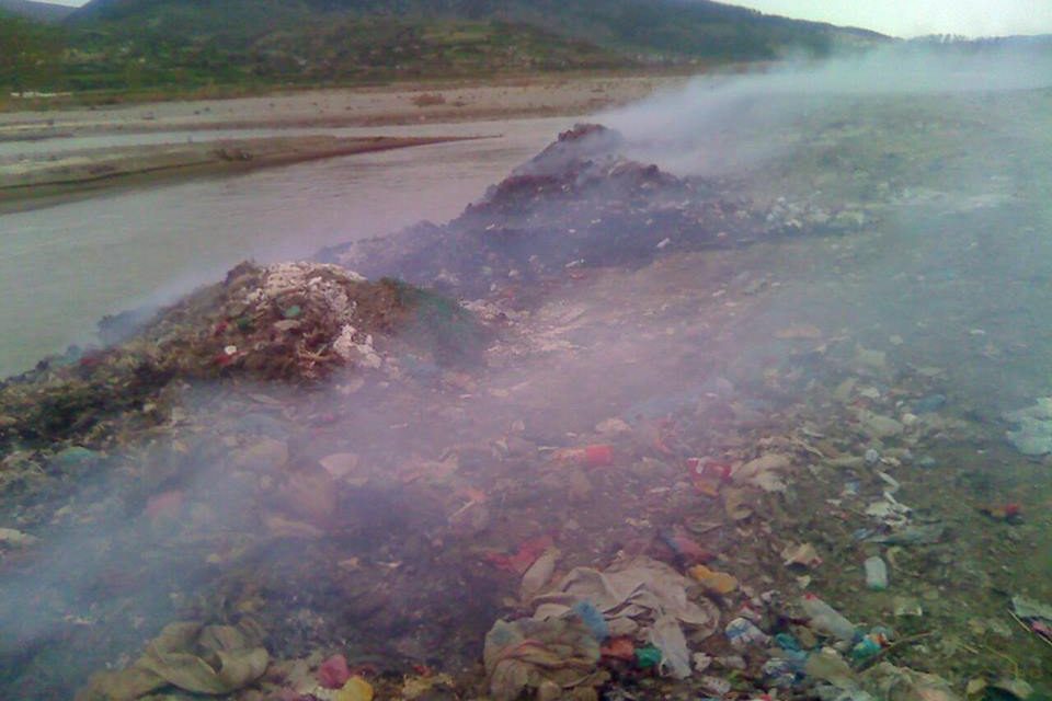 Fusha e djegies shkarkuese të mbeturinave të komunës Otllak, në rrethin e Beratit. Mbetjet jo vetëm që nuk groposen, por për t’u ricikluar as që mendohet akoma. Mbeturinat hidhen sistematikisht në ujërat e lumit Osum, duke e ndotur atë. Ju lutem mjaft më! (Fotoja u publikua ne uneraportoj.mjaft.org)