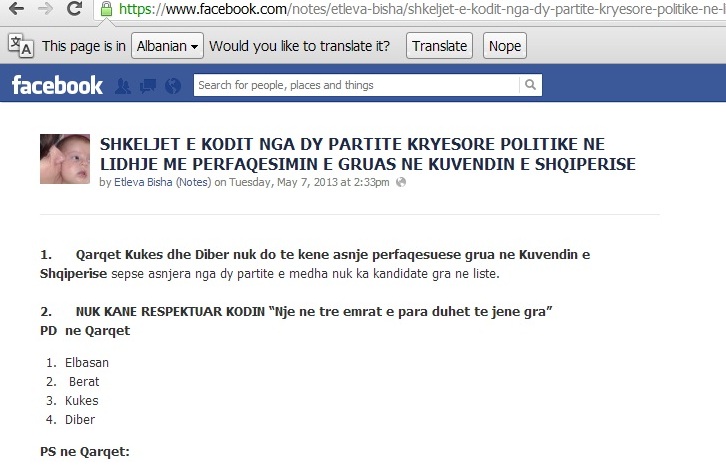 Etleva Bisha, anetare e Asamblese se PS dhe aktiviste e shoqerise civile boton ne profilin e saj ne Facebook nje pasqyre te dejatuar se ku dhe si eshte shkelur nga PS dhe PD Kodi Zgjedhor qe do te duhet te garantonte pjesemarrje me te gjere te gruas ne Kuvend.